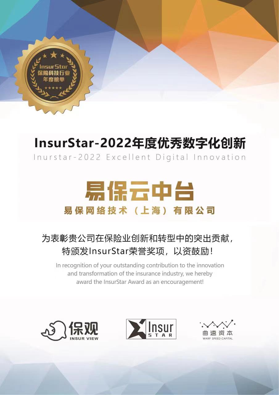 InsurStar 是保观创立的国内保险科技榜单品牌,旨在挖掘行业内表现突出、最具成长性、最具创新性的企业和从业者。2023 年 1 月 9 日保观公布的 “2022 InsurStar 行业榜单” 中,易保网络不负众望,凭借易保®云中台®获得“2022 年度 InsurStar 优秀数字化创新项目奖。