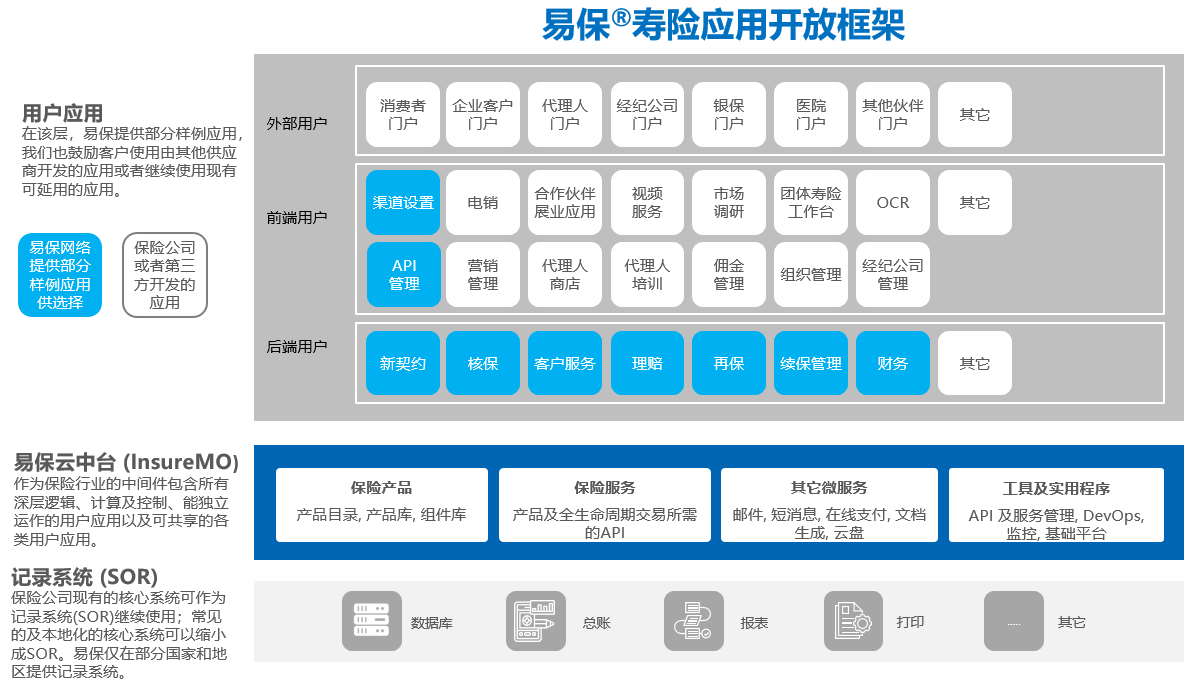记录系统(SOR),建议沿用既存的老核心,在老核心系统上做减法,使之成为记录系统。易保仅在部分国家和地区提供记录系统。